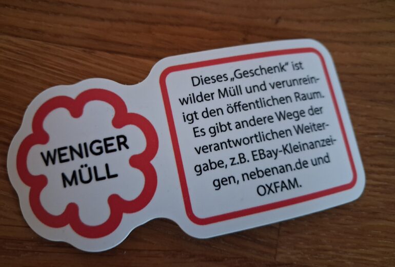 Ob aus Bequemlichkeit, Naivität oder Unwissenheit: Zu-Verschenken-Müll säumt vermehrt die Straßen. Neben Kisten voller Unrat, werden ganze Sperrmüllstücke wie z. B. Möbel an die Straße gestellt. Dort bleiben sie stehen. Manchmal versehen mit einem gutwilligen Schild: Zu Verschenken. Mit oder ohne einem …